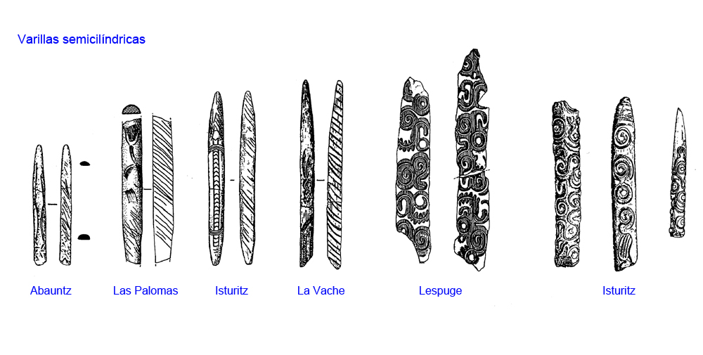Varillas – Poseen forma cilíndrica. Su morfología depende del tipo de materia prima base de su confección, que normalmente es asta de cérvido. Aparecen desde el inicio del Paleolítico Superior. La funcionalidad estaría vinculada a un instrumental arrojadizo o como piezas de engarce. Están decoradas con diseños geométricos.