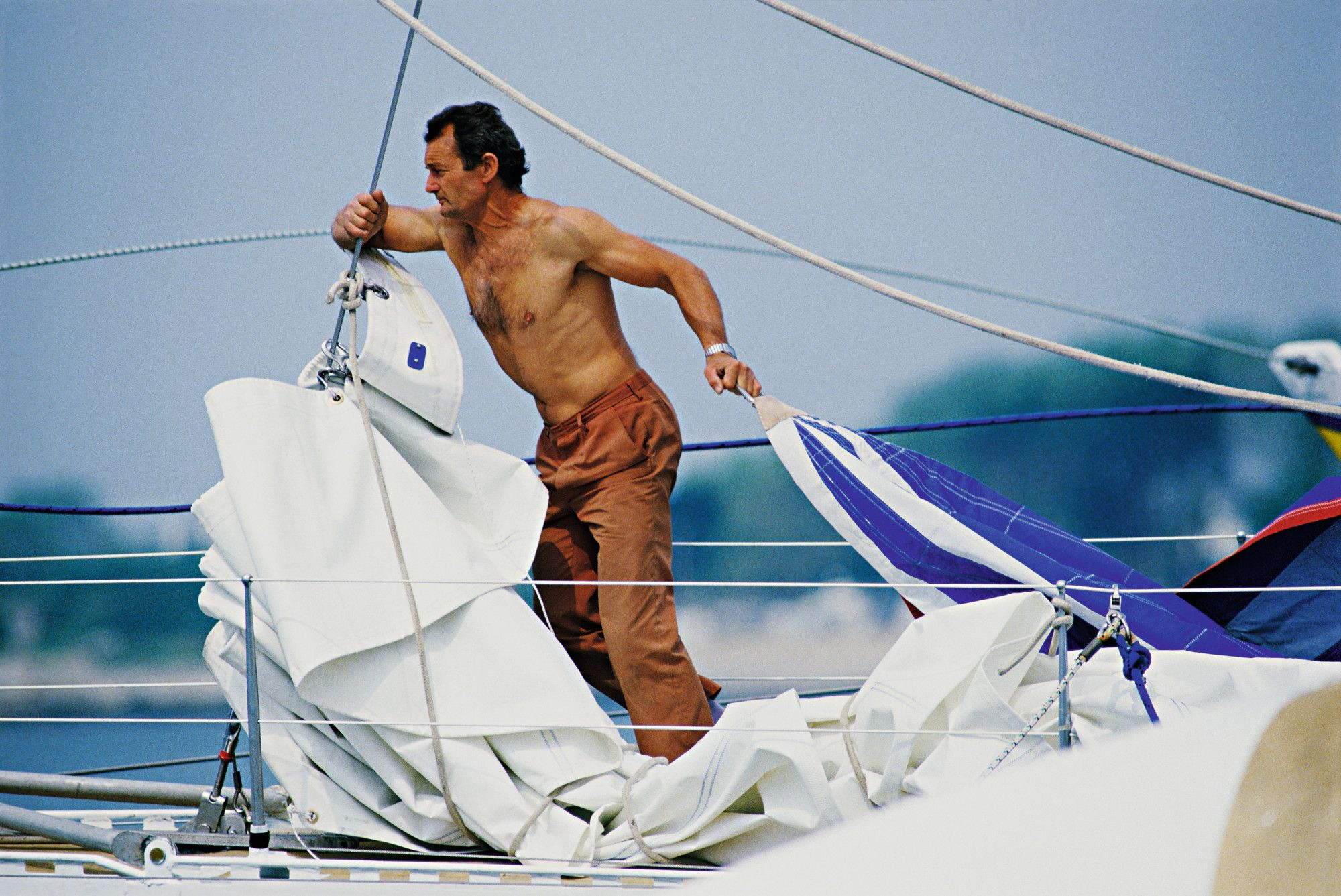 Tabarly bajando un foque para, posteriormente, ajustar un spi.