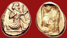 Aunque ya en la antigua Babilonia existían pequeñas cuentas de barro a las que se le atribuía un valor nominal, la moneda como tal nació durante el reinado de Ardis II, más conocido como Ardis de Lidia, que reinó entre los años 644 a.C. y 625 a.C. en Lidia, región situada al oeste de Anatolia -actual Turquía- y que abarcó desde el siglo XIV a.C. hasta el VI a.C. gracias al comercio y a la política exterior belicosa de este monarca, estas monedas estaban compuestas de electro -oro y plata-, se extendieron por la zona de Asia Menor, llegando a la península griega a mediados del siglo VI a.C., las monedas tenían grabado un león, el símbolo de los mermnados. Al caer Lidia en manos de los persas tras la batalla de Timbrea y el asedio de Sardes, Ciro II el Grande comenzó a acuñar monedas de oro con la representación de un arquero arrodillado, con un peso de 8,42 gramos.