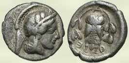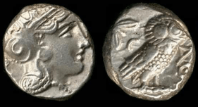Moneda de plata de 2,1g. Original ateniense. En el anverso encontramos la cabeza de Atenea con pendientes redondeados y casco adornado con hojas y flores. En el reverso se encuentra la clásica lechuza ateniense con rama de olivo e inscripciones.