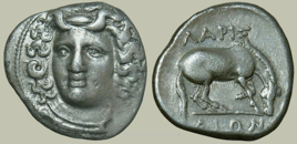 Moneda de plata de 5,8g. Original de Larissa. En el anverso tiene el rostro de la ninfa Larissa con collar y con peinado. En el reverso se encuentran inscripciones además de un caballo pastando.