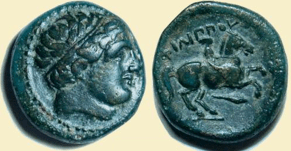 Moneda de bronce de 2,6g. Original de Macedonia. En el anverso se encuentra la cabeza de Apolo mirando hacia la derecha, con cinta en el pelo. En el reverso una inscripción y un jinete joven sobre un caballo galopando y una lanza en el suelo.