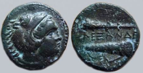 Moneda de bronce de 6,4g. Original de Macedonia. En el anverso encontramos la cabeza de Hércules con la piel de león. En el reverso un arco y carcaj, así como la maza de Hércules e inscripciones.
