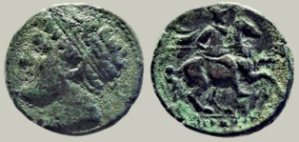 Moneda de bronce de 14,3g. Original de Siracusa. En el anverso se encuentra el busto de Hierón con el pelo sujeto por una cinta y mirando hacia la izquierda. En el reverso un jinete con capa, armado con lanza y cabalgando, además de inscripciones.