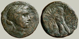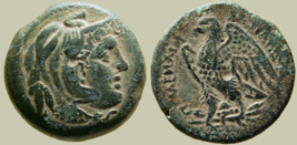 Moneda de bronce de 10,48g. Original de Alejandría. En el anverso un busto deificado de Alejandro Magno con piel de elefante y mirando hacia la derecha. En el reverso se encuentra una inscripción además de un águila sobre un rayo.