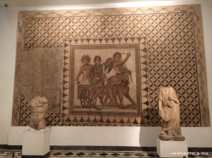 Aunque el mejor ejemplo que podemos encontrar en cuanto a mosaico en todo el Museo Arqueológico de Sevilla se encuentra en la sala XIII, la cual alberga un impresionante mosaico del Triunfo de Baco encontrado en Écija (Sevilla, España) y perteneciente al siglo III.